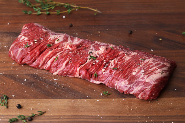 Skirt steaks are versatile and full of flavour. When cooked on high heat, the characteristic marbling imparts an outstanding flavour. Slice it thick against the grain before serving to ensure maximum tenderness.