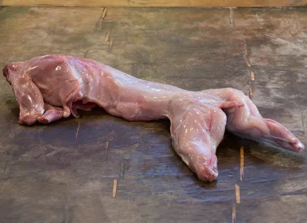 You have the choice of the whole rabbit as is – unprocessed with its fur and head on – or oven ready. The oven ready rabbit is jointed by our expert butchers into five pieces: four legs and the saddle (back). We also give you the option of the rabbit in fur but gutted and the option of skinned rabbit but not gutted.